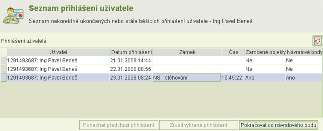 Pokud byla aplikace při předchozím přihlášení nesprávně ukončena, po opětovném spuštění se zobrazí formulář Seznam přihlášení uživatele, kde je možnost: