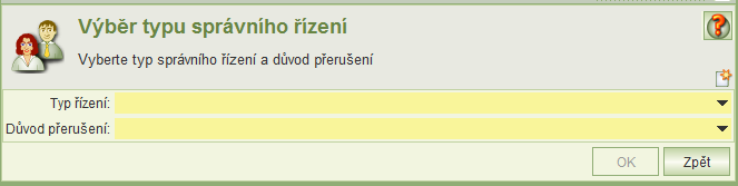 U některých typů písemností zobrazí aplikace před samotným generováním tisku formulář pro výběr typu správního řízení.