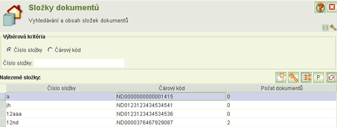 Pro vytvoření nové složky se použije tlačítko Nový záznam. Zobrazí se formulář Vytvoření složky dokumentu, kde je potřeba zadat číslo složky a vložit čárový kód.