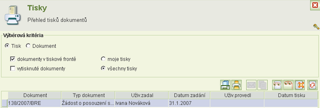 Formulář zobrazuje záznamy o všech dokumentech aplikace, které byly vytisknuty nebo čekají na tisk v tiskové frontě. Dokumenty, které čekají v tiskové frontě, lze v této úloze vytisknout nebo jejich zařazení v tiskové frontě zrušit.