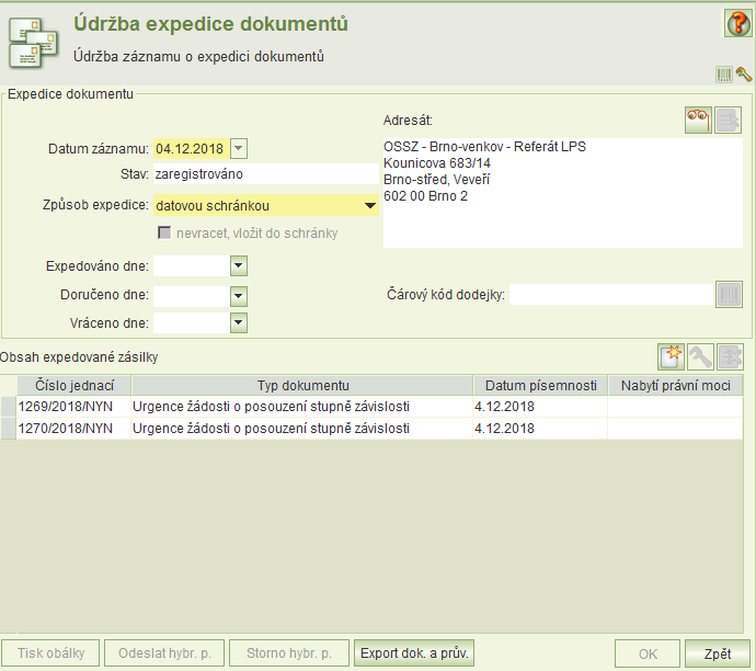 o expedici. Na formuláři je možné vytisknout obálky a upravit datum