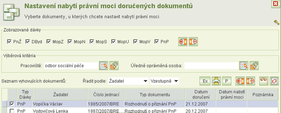 Každý záznam je vlevo opatřen zaškrtávacím políčkem. Záznamy lze zaškrtnout - hromadně nebo individuálně - a pro zaškrtnuté záznamy přiřadit hromadně odpovídající datum nabytí právní moci pomocí tlačítka Nabytí PM.