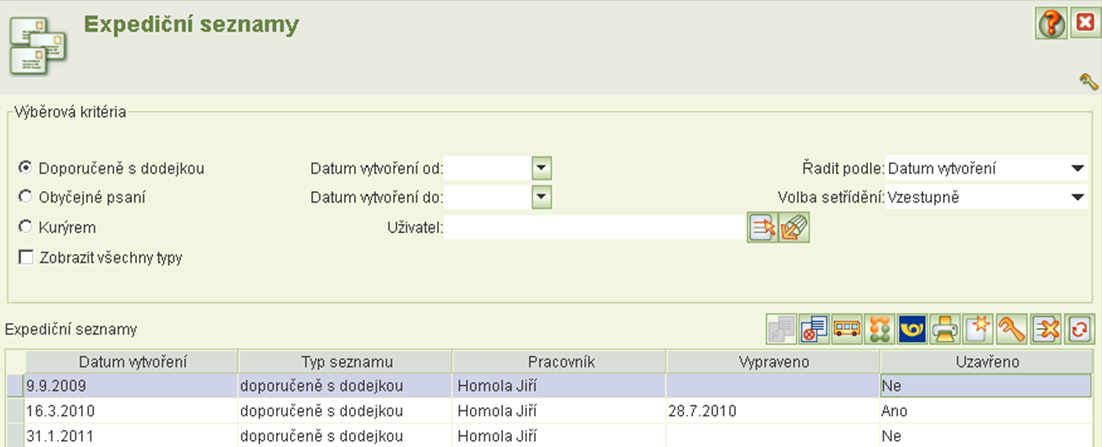 Do seznamu lze zadat dokumenty, u kterých není zadán datum expedováno dne (expedovaná zásilka musí být ve stavu zaregistrováno). Po uložení seznamu zásilek k vypravení se v expedičním seznamu zadá datum vypravení pomocí tlačítka Vypravení seznamu. Po zadání tohoto data se seznam uzavře a v expedičních zásilkách se automaticky doplní datum vypravení, tím se nastaví expedice do stavu vypraveno.