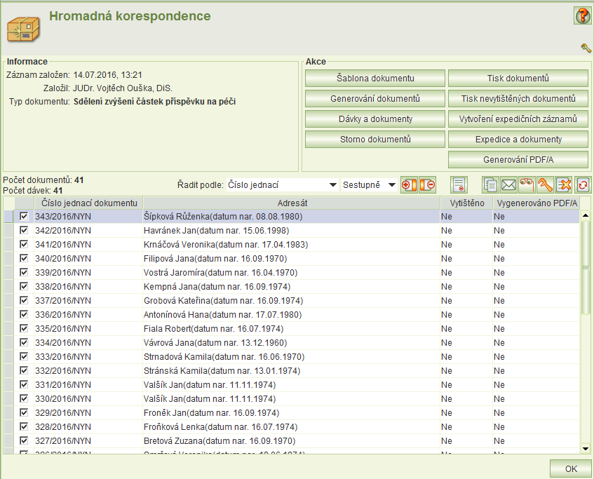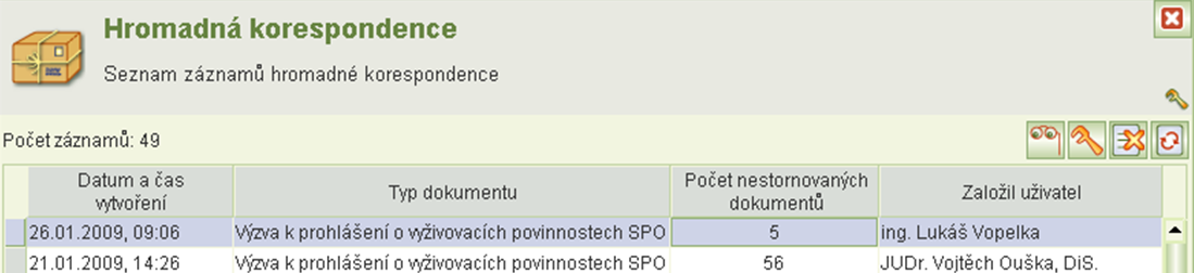 Jednotlivé záznamy hromadné korespondence jsou identifikovány časem, názvem šablony a jménem obsluhy, která záznam vytvořila. Dále se zobrazuje počet nestornovaných vygenerovaných dokumentů.
