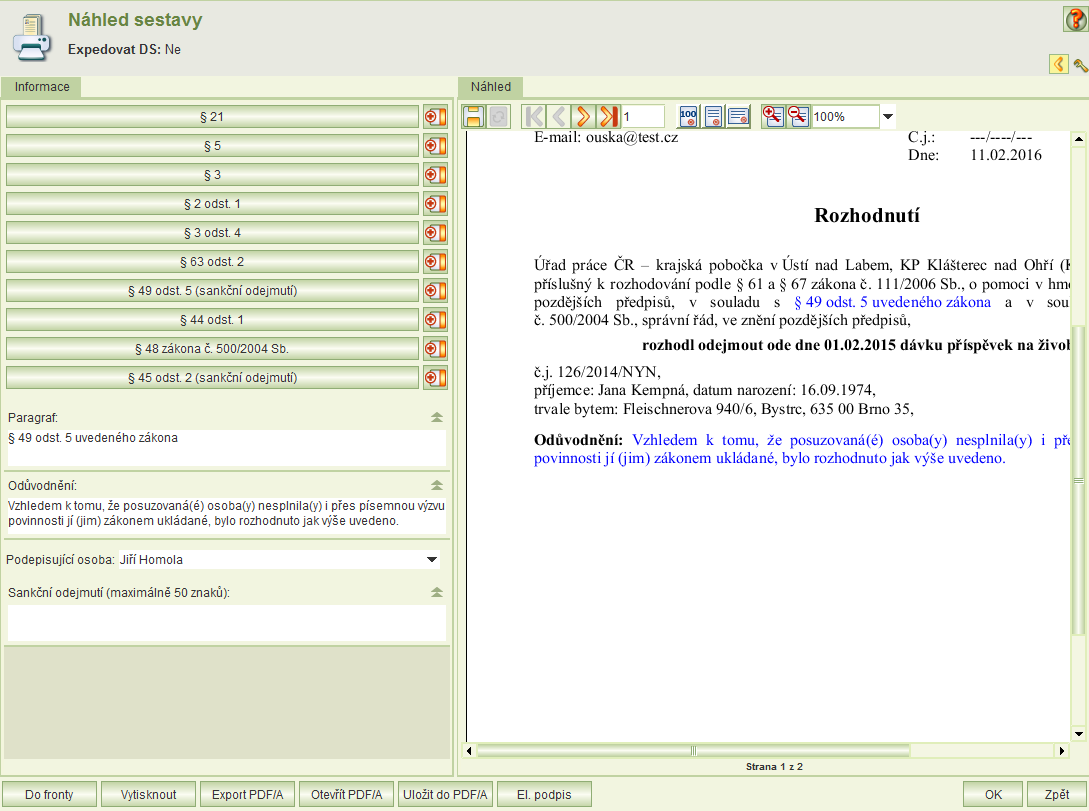 V dolní části formuláře jsou tlačítka pro tisk, nastavení do tiskové fronty, export, uložení a otevření PDF/A, el. podpis a pro potvrzení písemnosti.